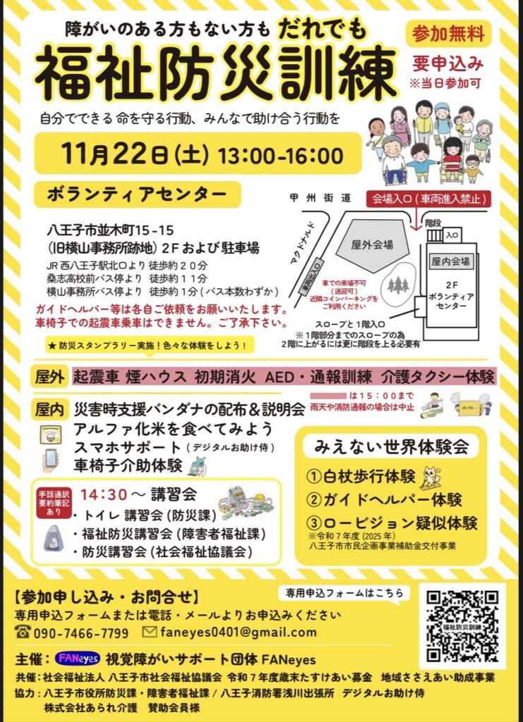 ※会場の駐車場は、福祉防災の野外訓練で使用します。お車でお越しの方は、近くのコインパーキング等の駐車場をご利用ください。